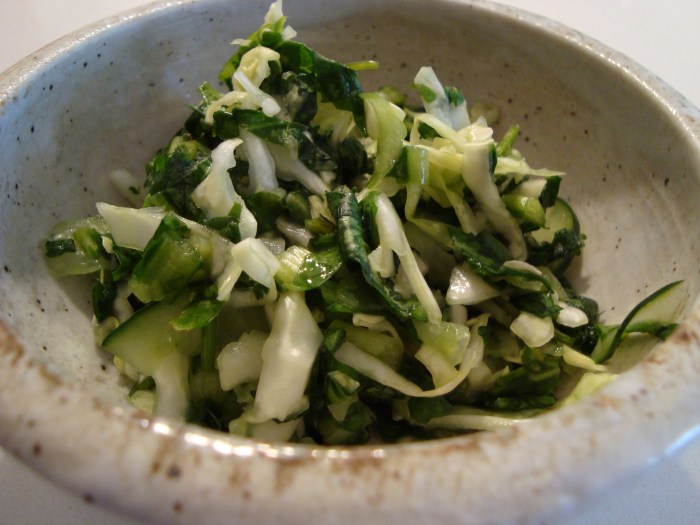 When I don’t have time to wait for 15 to 30 minutes, I use “Plum Vinegar” to cheat. I cut vegetables (normally, I use daikon, cabbege, dangelion, cucumber, celantro ), add the vinegar and mix and rub them with hand. That’s it! This vinegar is very salty, so don’t put too much. Use one or two tea spoon and taste it as you rub.