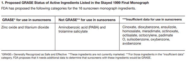 Moreover, in 2019 FDA published a proposed guideline to reclassify 16 sunscreen monograph ingredients that were categorized safe back in 1999. Of the 16 currently marketed active ingredients, two ingredients – zinc oxide and titanium dioxide – are GRASE (Generally Recognized As Safe and Effective) for use in sunscreens; two ingredients – PABA and trolamine salicylate – are not GRASE for use in sunscreens due to safety issues. There are 12 ingredients for which there are insufficient safety data to make a positive GRASE determination at this time. Please see below.