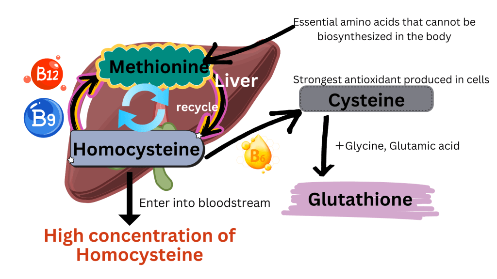 Homocysteine is created when methionine is recycled in the liver, and folic acid and vitamin B12 are needed to convert it back to methionine in the liver. Deficiency of these nutrients results in excess homocysteine because the conversion of homocysteine to methionine is blocked. The resulting condition that flows out of the liver into the bloodstream is hyperhomocysteinemia. Also, if vitamin B6 is deficient, homocysteine cannot be converted to glutathione via “cystathionine,” resulting in “hyperhomocysteinemia” as well.