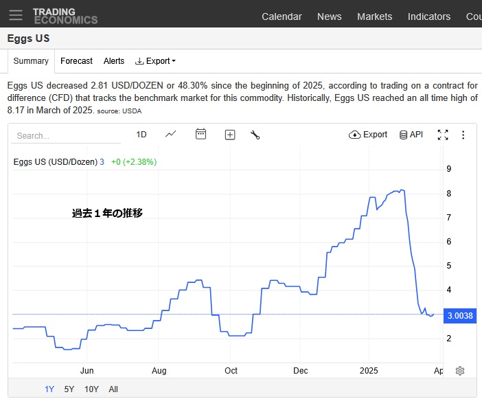 But on the 9th of this month, the Justice Department announced that it is investigating the egg price hikes. A few days later, egg prices dropped dramatically, with wholesale prices reportedly falling 54% over the past month. The decline is attributed to the absence of an avian flu outbreak and farmers rebuilding their flocks, while claims of price gouging by egg producers are said to have accelerated the decline. Small farmers and consumer advocates accuse the big egg producers of keeping prices high.