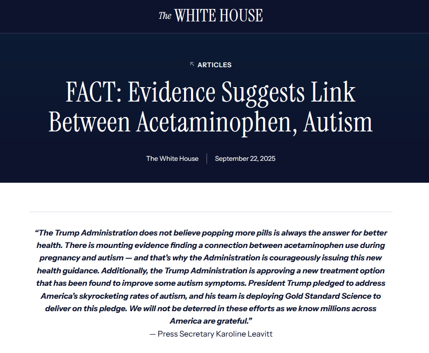 In fact, the company’s website states that “reliable independent scientific data continues to show that there is no proven link between taking acetaminophen and autism” and that “there is no reliable science showing that taking acetaminophen causes autism.” In response, the White House announced this press release which included links to studies from top research institutions, including Harvard, Johns Hopkins University, Mount Sinai and University of Massachusetts, that identified a link between Tylenol used during pregnancy and autism.